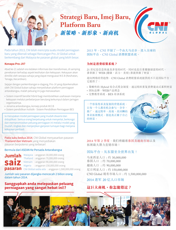 Berakar umbi di Malaysia dengan asas organisasi yang kukuh dan pasaran pelanggan yang luas, kami tetap menjadikan pasaran ASEAN sebagai sasaran dalam memperluaskan perniagaan kami. Pasaran Thailand dan Vietnam akan mula diterokai tahun ini setelah kami berjaya mendapatkan lesen perniagaan di China. Kami juga bersiap- sedia merancang untuk menembusi kesemua negara-negara ASEAN yang mempunyai jumlah populasi lebih 500 juta orang bagi mencapai sasaran jangka panjang untuk memperkukuhkan perniagaan.